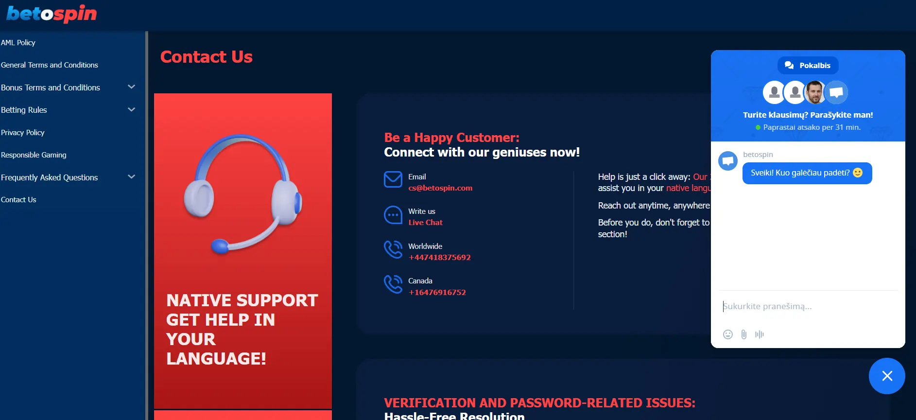 - „BetOspin“ klientų aptarnavimas
