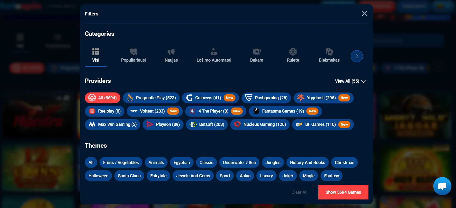 Kazino žaidimus galima lengvai peržiūrėti naudojant įvairius filtrus, tokius kaip „Populiariausi“, „Nauji“, „Labiausiai patinka“ bei pasirinkti žaidimus pagal tiekėjus ir temas.