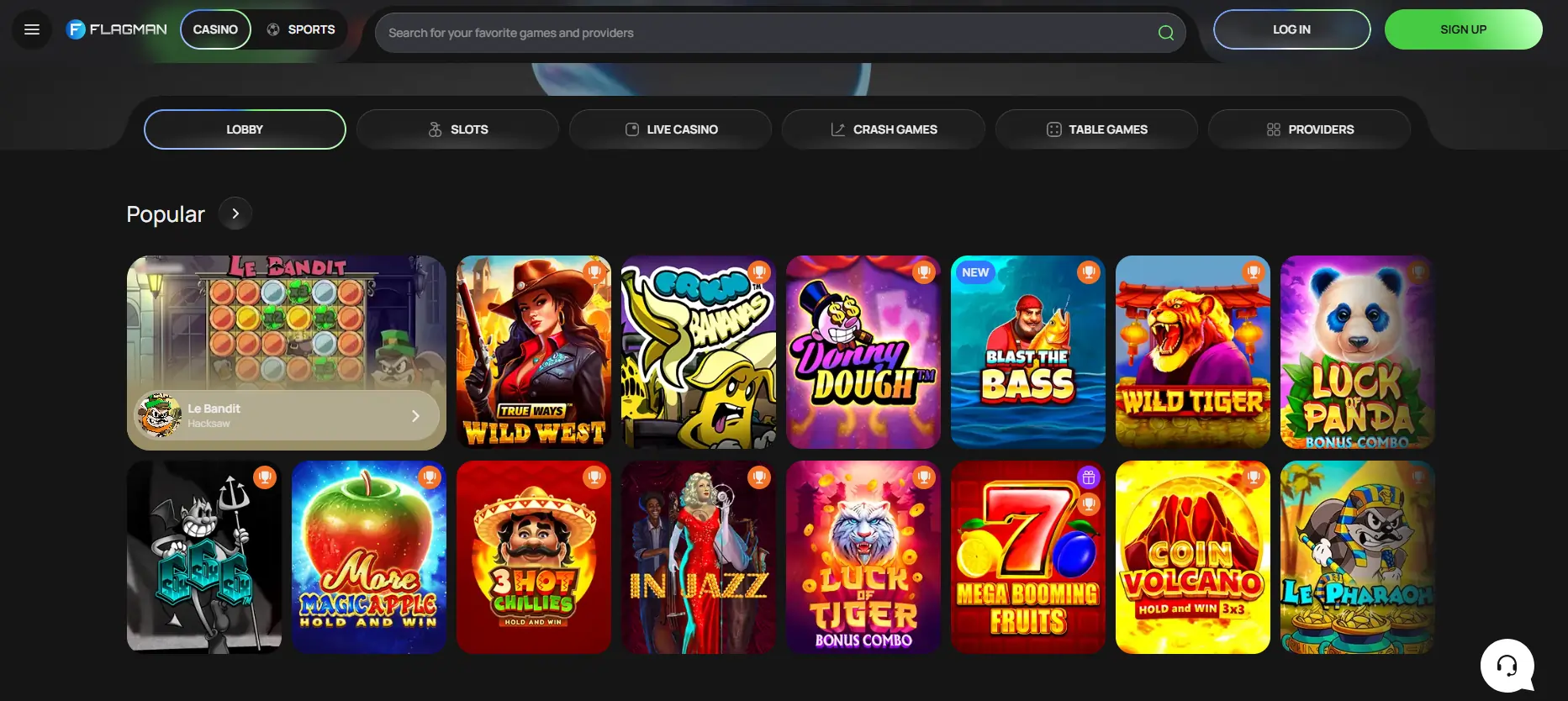 Flagman kazino siūlo platų žaidimų pasirinkimą, įskaitant lošimo automatus, stalo žaidimus, kazino gyvai ir „crash“ žaidimus.