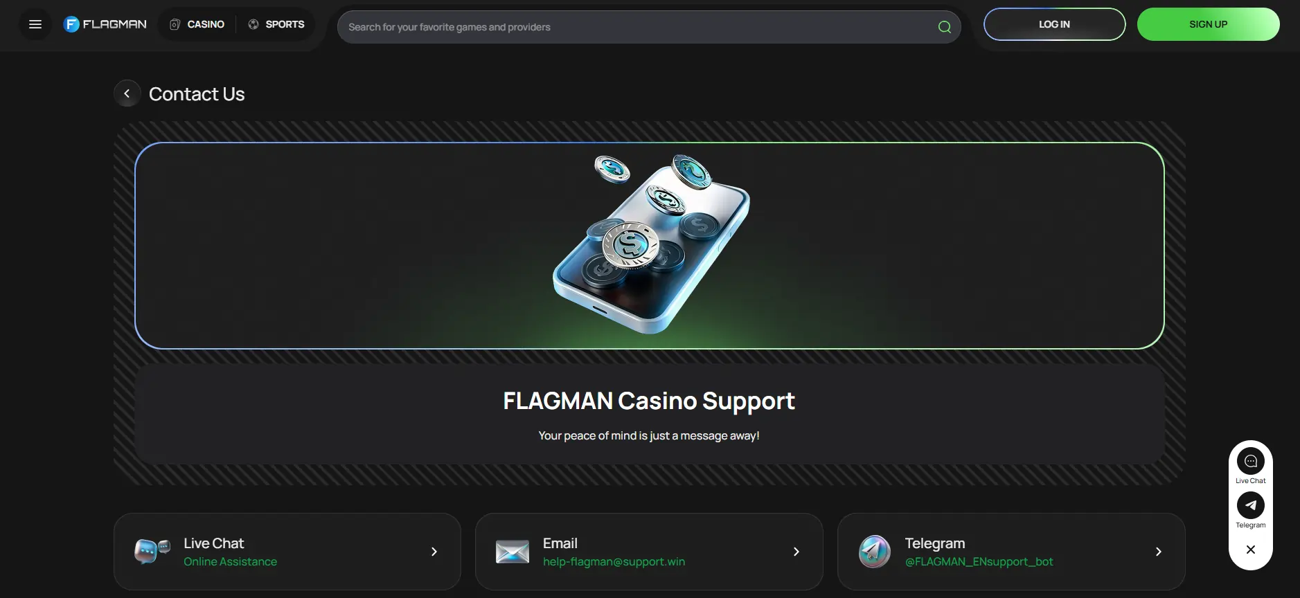 Tačiau „Flagman“ kazino klientų aptarnavimas yra prieinamas tik anglų ir rusų kalbomis. Tai gali apriboti pagalbą žaidėjams, kalbantiems kitomis kalbomis.