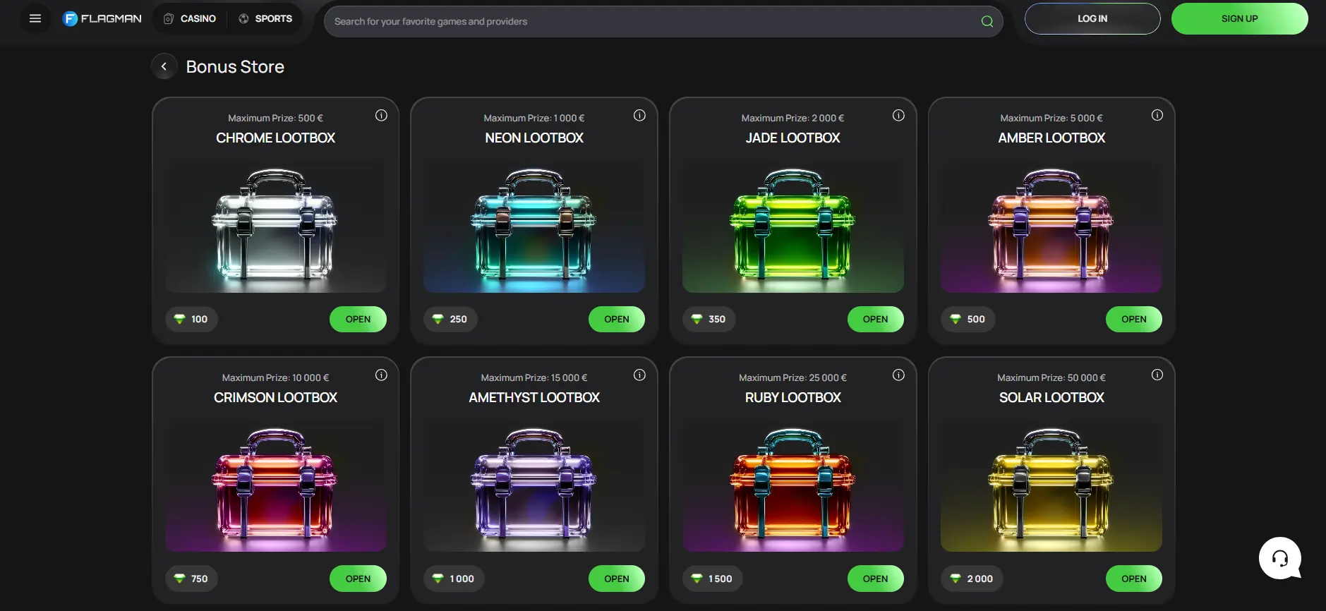Taip pat kazino siūlo „loot box“. Žaidėjai gali panaudoti uždirbtus brangakmenius, kad atrakintų dėžutes ir laimėtų piniginius prizus. Kiekvienos „loot box“ kaina svyruoja nuo 100 iki 2 000 brangakmenių, o maksimalus prizas – nuo 500 iki 50 000 €. Pasiūlymas galioja 3 dienas ir suteikia galimybę laimėti iki 10 kartų daugiau.