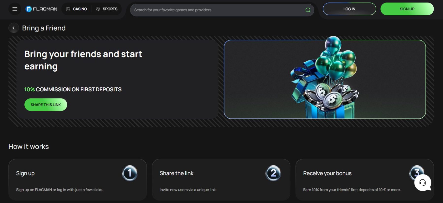 Pakvietę draugus, galite uždirbti net nežaisdami. Pakanka pasidalinti savo asmenine kvietimo nuoroda – draugui įnešus bent 10 €, jūs gaunate 10 % nuo jo įneštos sumos.