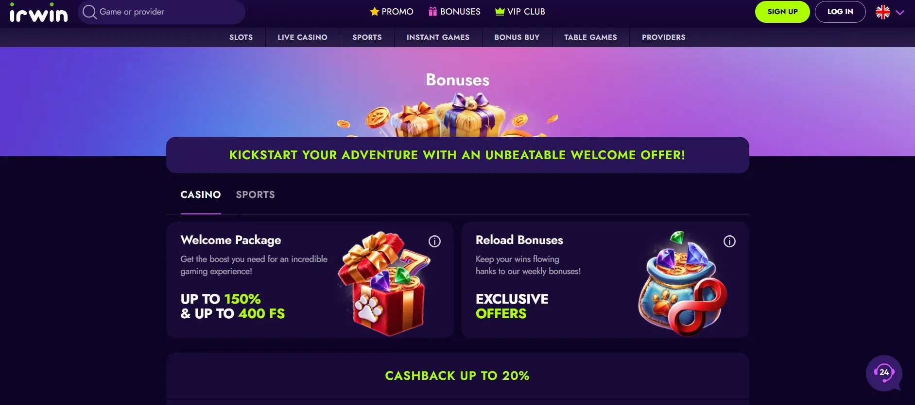 Nauji „Irwin“ žaidėjai gali gauti 150 % premiją už pirmąjį indėlį ir iki 400 nemokamų sukimų už antrąjį indėlį. Šiam pasiūlymui taikomas 10x statymo reikalavimas prieš išmokant pinigus.