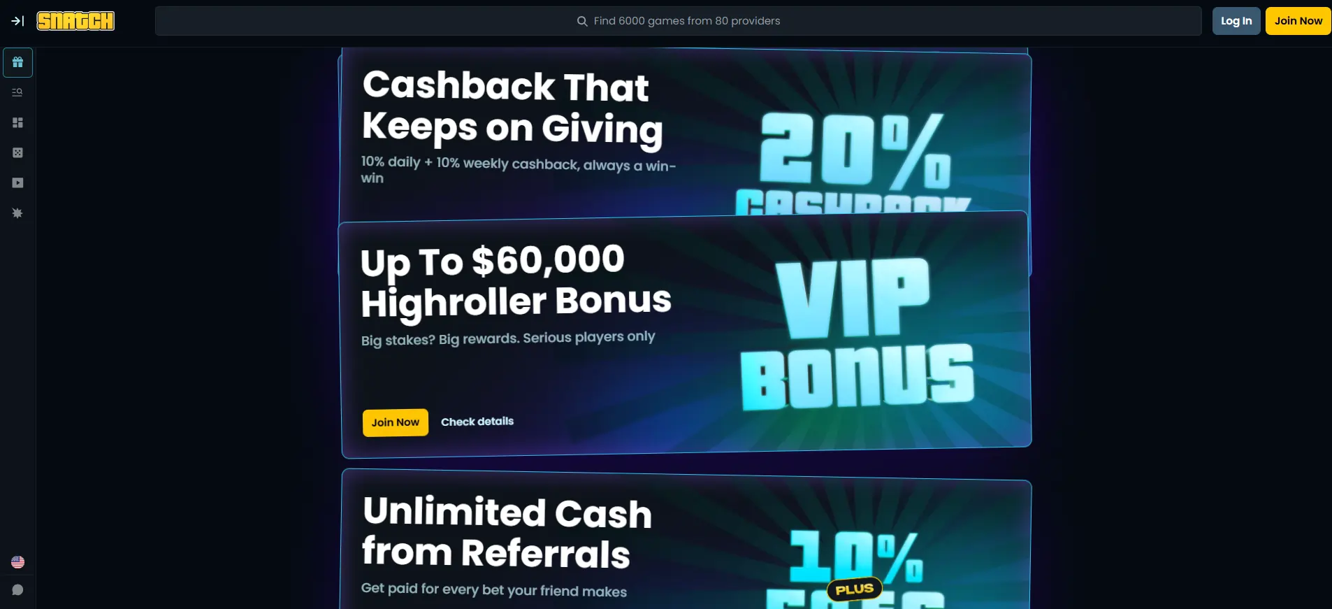 „Snatch Casino“ žino, kaip palepinti savo žaidėjus – ypač didesnes sumas mėgstančius statyti (high rollers). Mūsų komanda išbandė bonusų pasiūlymus ir įvertino juos kaip vertus dėmesio – nuo įnašų premijų iki lojalumo taškų, kurie auga su jūsų aktyvumu.