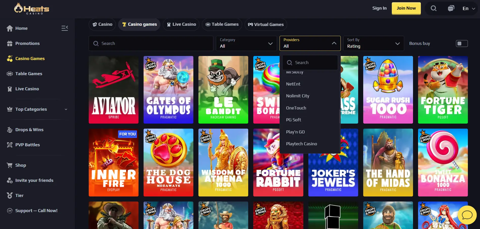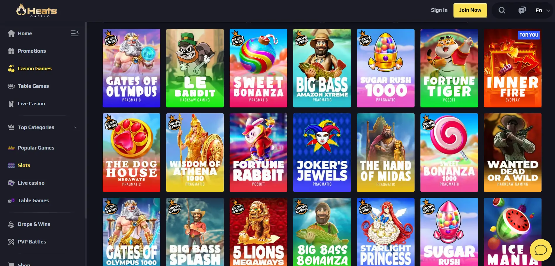 „HeatsCasino“ žaidimų automatų skyriuje yra daugiau nei 3 000 įvairių kategorijų lošimo automatų su įdomiomis funkcijomis. Kaip jau minėta, žaidimai yra iš pripažintų paslaugų teikėjų, todėl daugelio žaidimų RTP rodiklis siekia 96 % ir daugiau.
