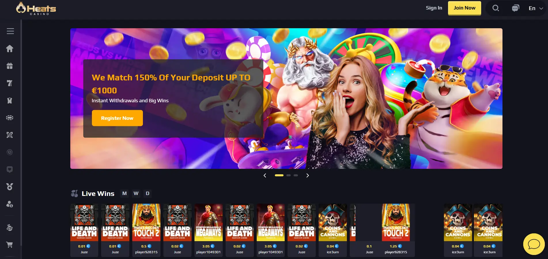 Rodyti daugiau 👀„HeatsCasino“ – tai gana naujas kazino internete, kuris savo platformą žaidėjams iš įvairių rinkų atvėrė tik 2024 metų lapkritį. Svetainė iš karto sulaukė didelio dėmesio iš tų, kurie ieškojo naujos vietos žaisti, tad nusprendėme ją išbandyti ir mes.