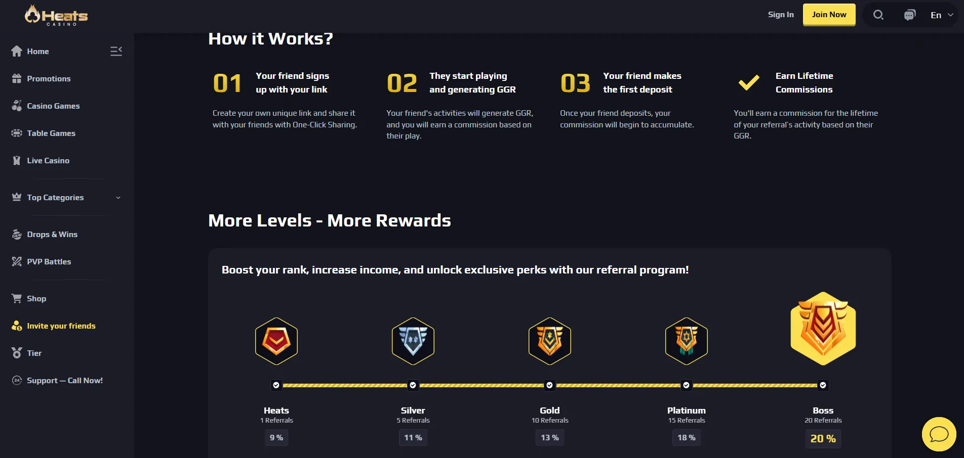 Kviesdami draugus per unikalią nuorodą į „HeatsCasino“ jūs taip pat gaunate atlygį, kurio dydis priklauso nuo to, kiek pakviestų draugų prisijungė ir įsitraukė į „Heats“ žaidėjų bendruomenę. Premijos dydis siekia nuo 9% iki 20%.