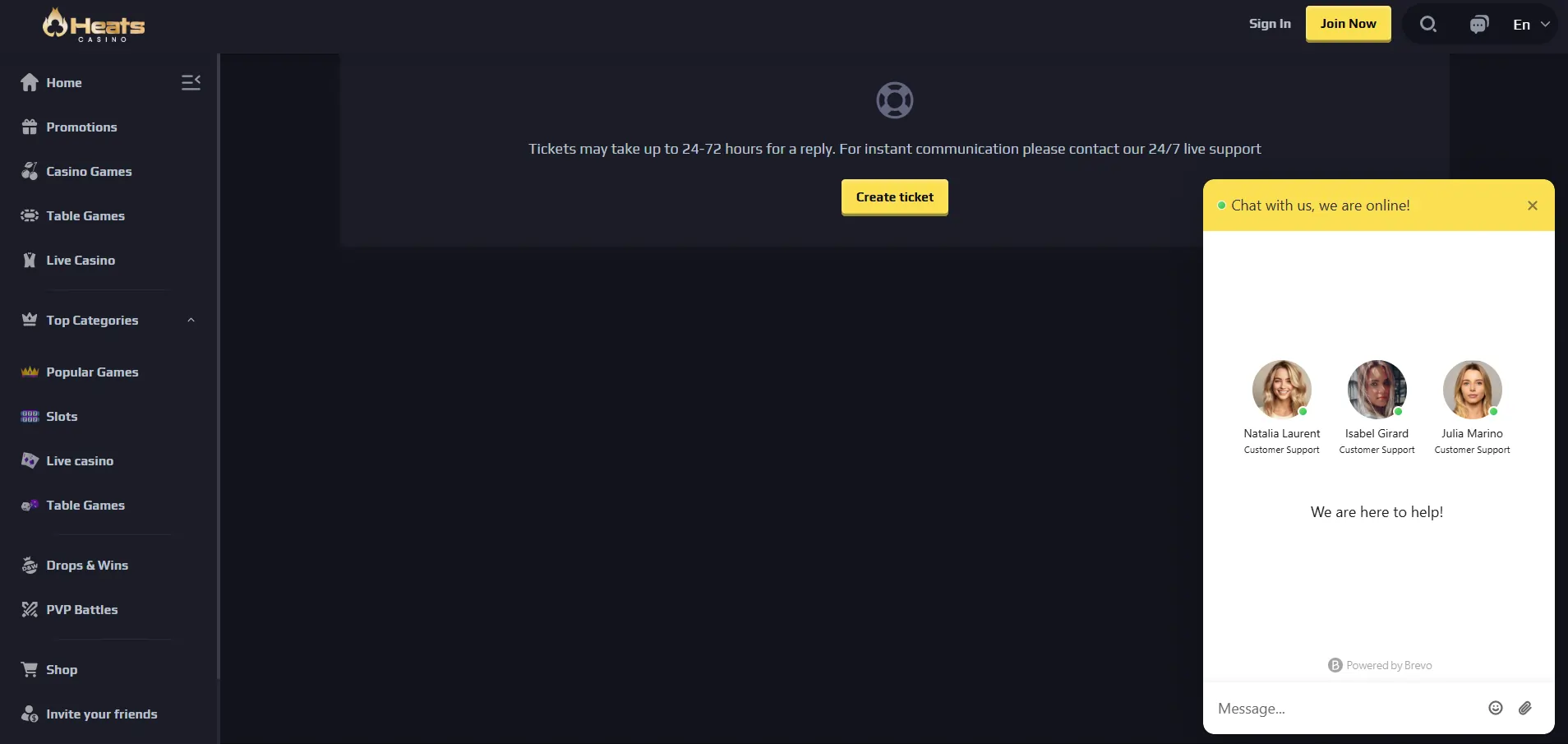 „HeatsCasino“ savo nariams klientų aptarnavimą užtikrina visą parą. Kad bendravimas vyktų sparčiausiai, rekomenduojame naudotis pokalbių gyvai galimybe. Mūsų patirtis parodė puikų atsakymo laiką, nes sujungimo su agentu teko laukti ne ilgiau nei kelias sekundes.