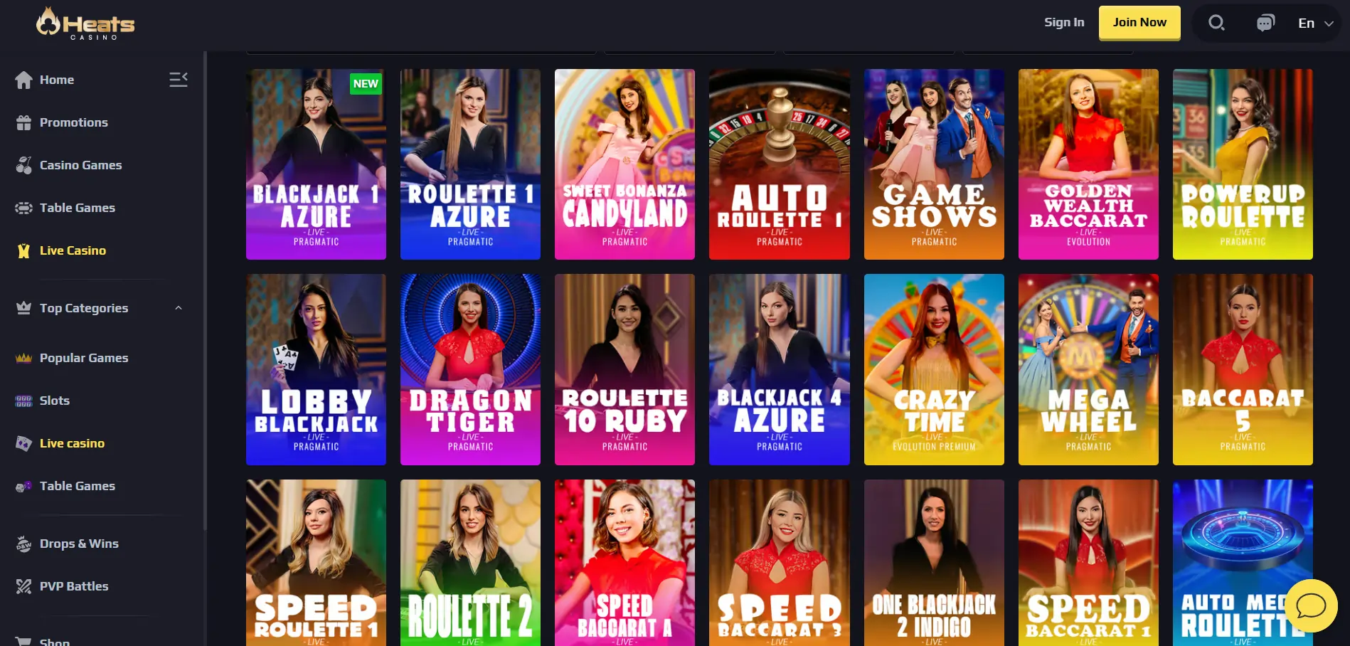 Bendradarbiaudamas su pripažintais žaidimų tiekėjais, „HeatsCasino“ garantuoja aukščiausius gyvų kazino žaidimų kokybės standartus. Juos išbandę galime teigti, kad transliacija vyksta be trikdžių, maloniai nuteikia profesionalūs dalintojai ir maloni žaidimo aplinka.