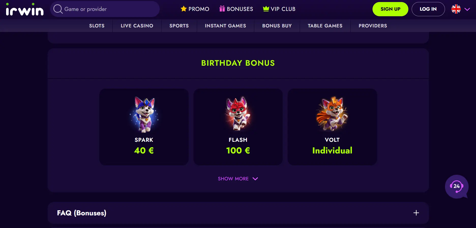 „Irwin“ kazino siūlo dvi pasveikinimo premijas. Kazino pasveikinimo pasiūlymas suteiks jums iki 600 € ir 400 nemokamų sukimų per pirmuosius du įnašus. Sporto lažybų pasveikinimo premija suteiks atitinkamas premijas per pirmuosius tris įnašus.
