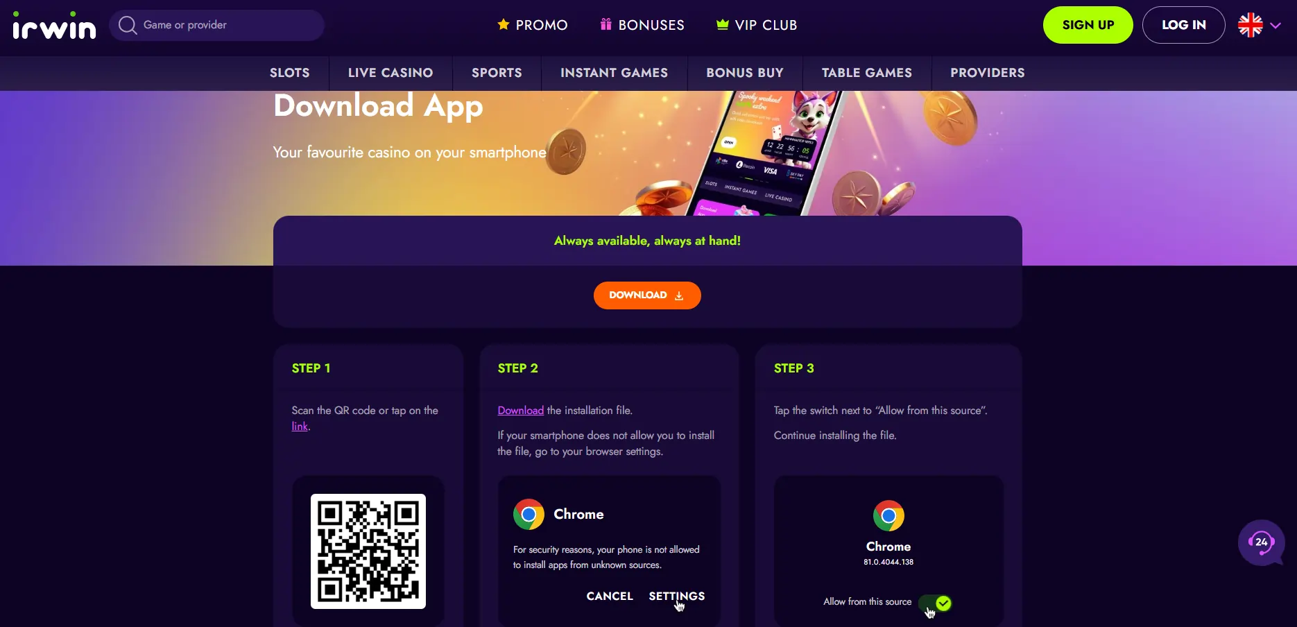 „Irwin“ kazino yra mobiliems įrenginiams pritaikyta kazino svetainė. Jos aplikacija „Android“ įrenginiams yra nemokama atsisiųsti. Norint žaisti mobiliajame įrenginyje, reikės stabilaus interneto ryšio.