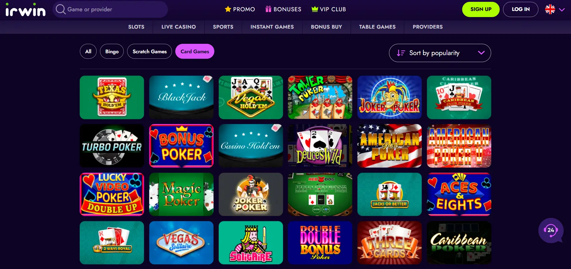 Jei norite žaisti tokius variantus, kaip „Blackjack“ ir pokeris, ieškokite jų kortų žaidimų kategorijoje. „Bingo“ ir scratch žaidimai taip pat turi savo poskyrius.