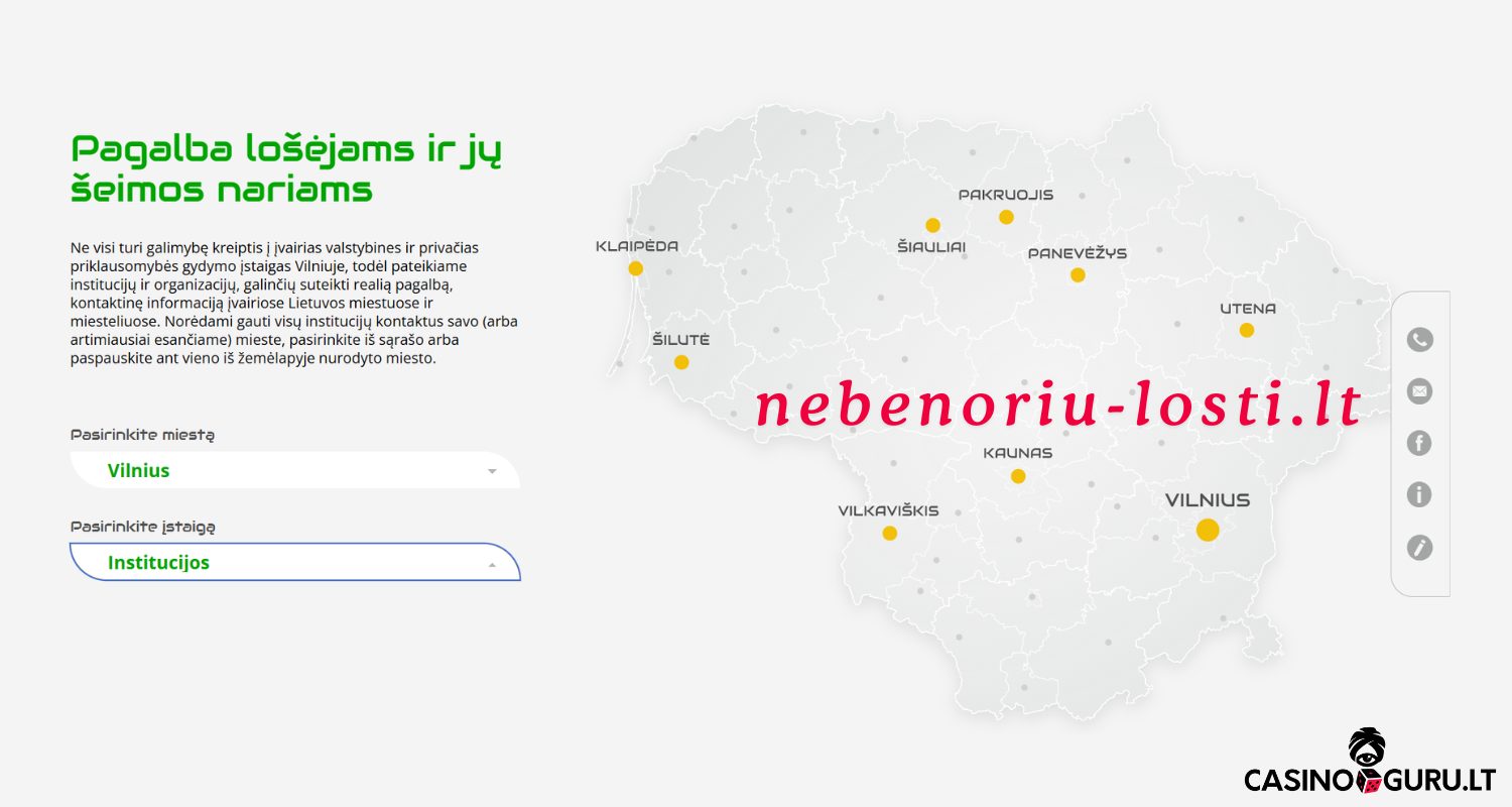 Daugelyje šalių veikia nacionalinės pagalbos linijos, teikiančios konfidencialius patarimus ir jungiančios jus su vietos pagalbos paslaugomis. Viena iš tokių socialinių iniciatyvų Lietuvoje – nebenoriu-losti.lt, teikianti pagalbą ne tik lošėjams, bet ir jų šeimos nariams.