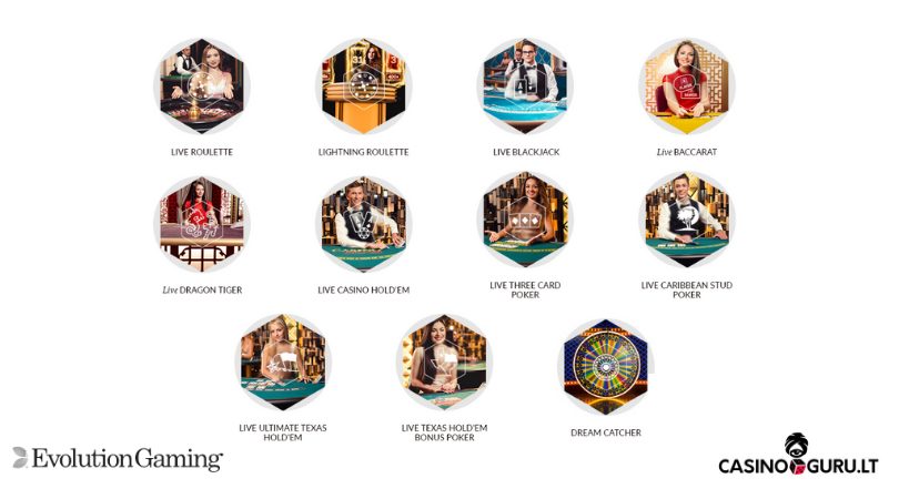 Kazino gyvai yra siūlomi Evolution Gaming žaidimai, todėl, galėsite mėgautis kokybiškais blackjack, ruletės bei Baccarat žaidimais.