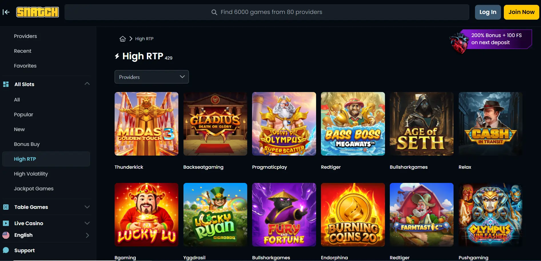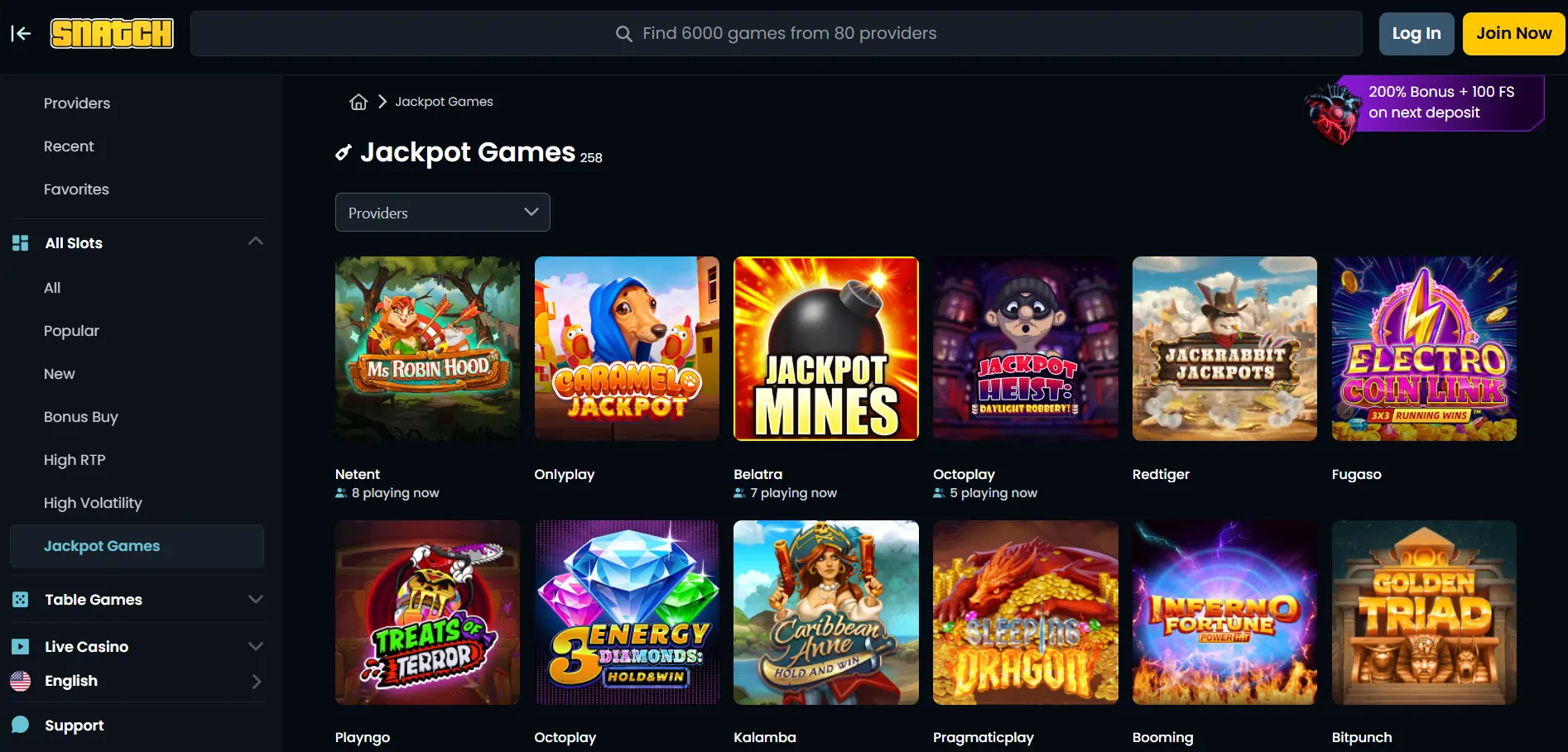 „Snatch Casino“ žaidimų bibliotekoje – daugiau nei 7 000 įvairių žaidimų iš patikimų tiekėjų. Galima rinktis iš lošimo automatų, stalo žaidimų bei „live“ kategorijos. Taip pat siūlomi jackpot žaidimai, pritaikyti didelių statymų mėgėjams.