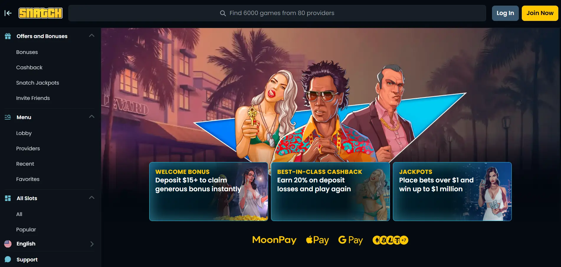 Išbandę „Snatch Casino“ svetainę, negalėtume paneigti, kad šios svetainės dizainas išties įspūdingas. Ryškios, bet akiai malonios spalvos, o visa platforma alsuoja „Grand Theft Auto“ stiliumi. Veikėjai žaidimo metu sukuria įspūdį, kad esate „gaujos“ dalimi.