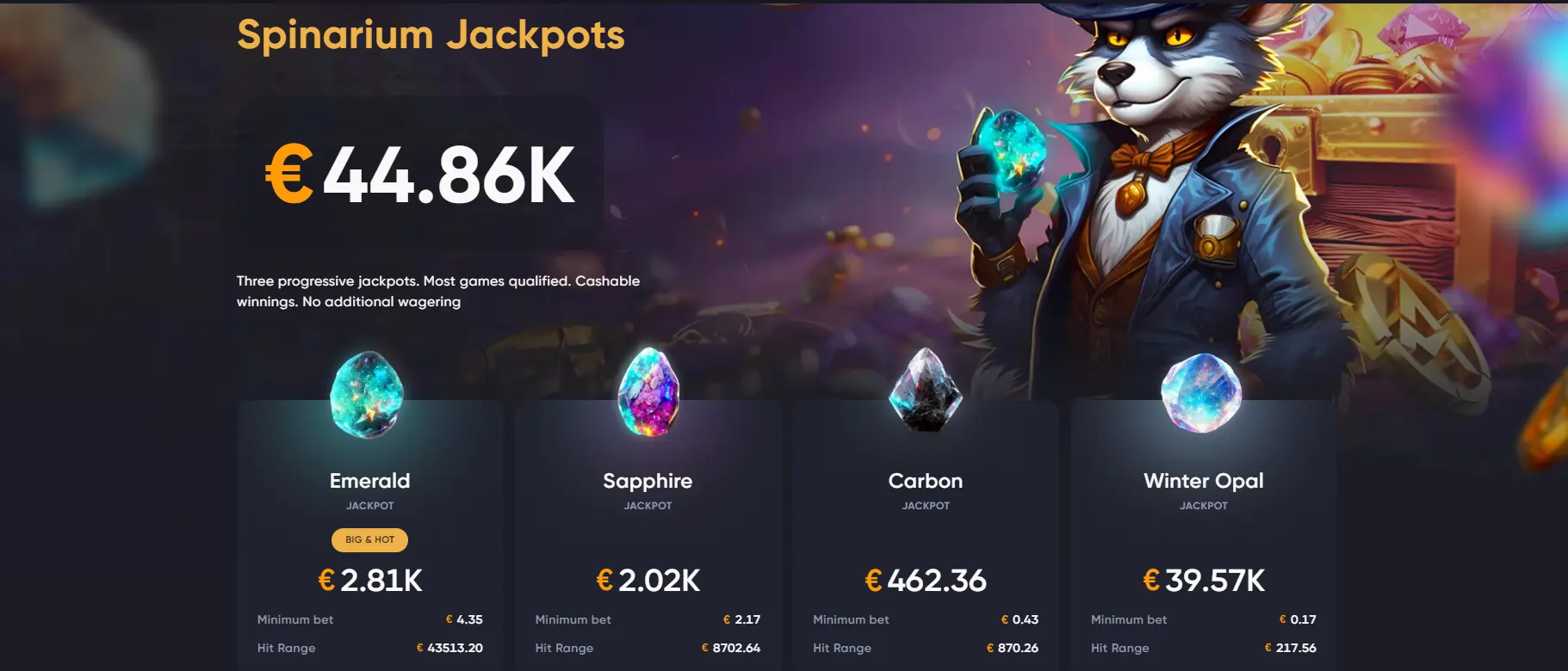 Be standartinių fiksuotų ir progresyvinių jackpot žaidimų, yra keturi išskirtiniai „Spinarium“ Jackpots, kuriuos privalome paminėti: