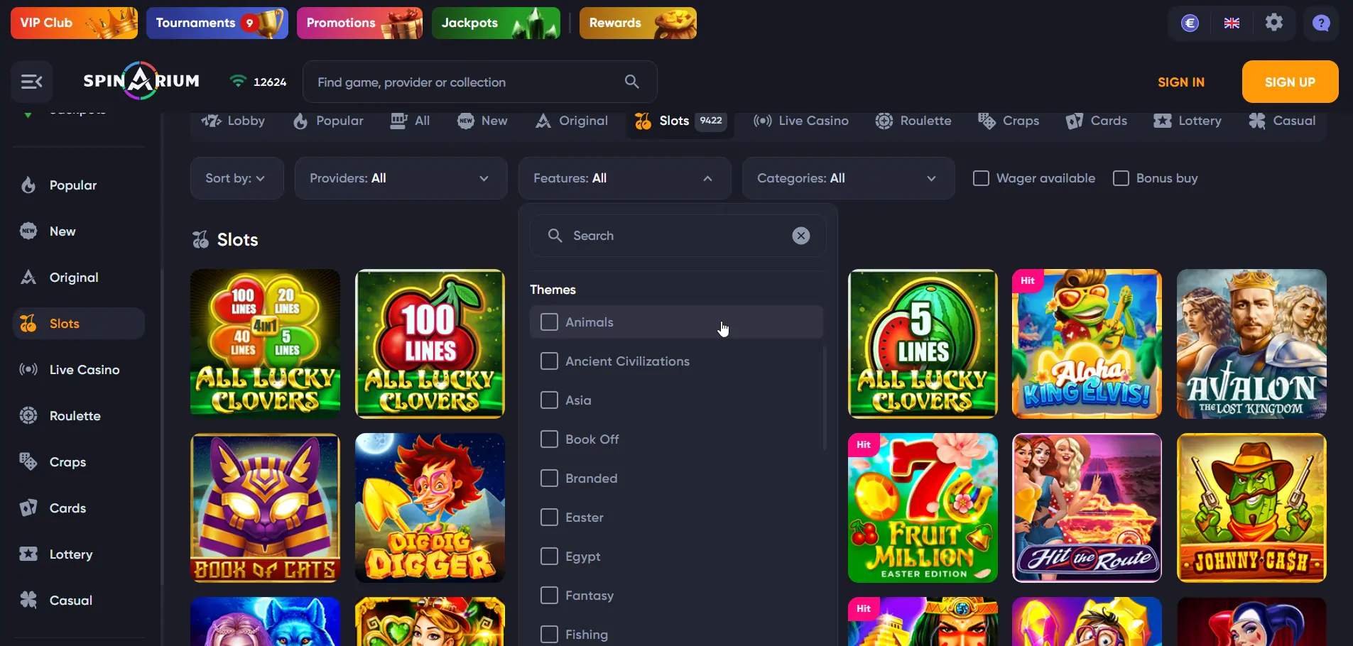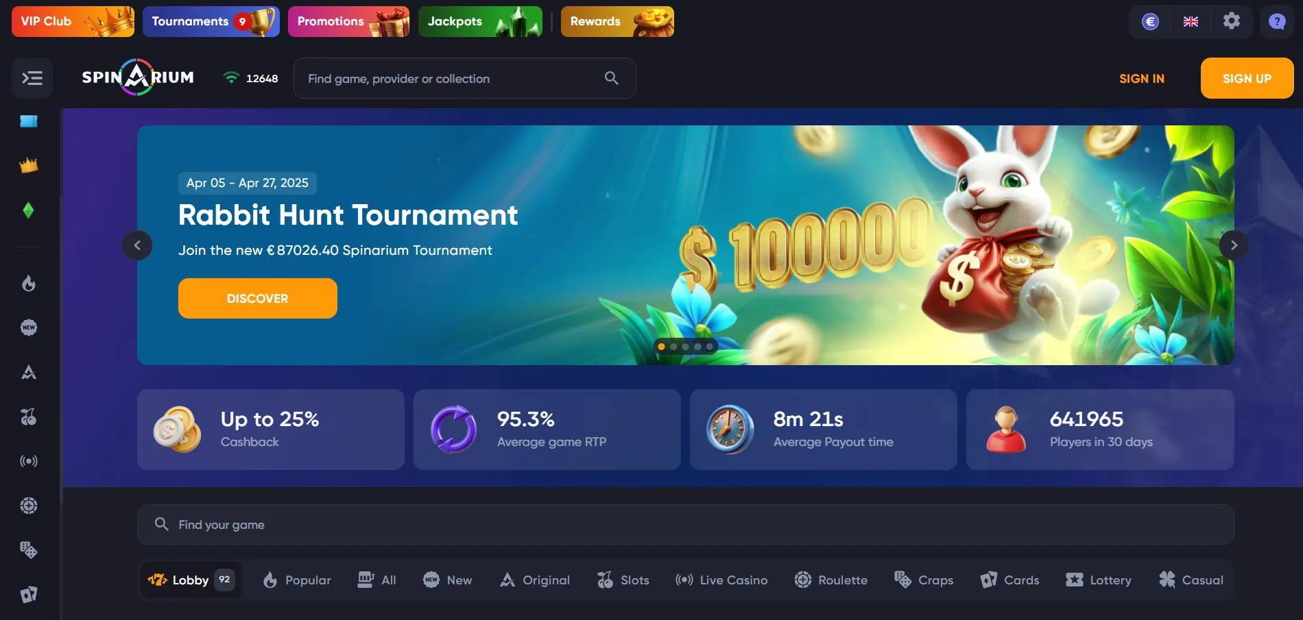 Visi žaidimai yra patogiai suskirstyti į kategorijas, tad dažnai pakanka vos vieno paspaudimo norimam žaidimui rasti. Papildomas „Wager available“ filtras suteikia prieigą prie visų žaidimų, kurie atitinka lažybų reikalavimus. Tai sumanus žingsnis iš „Spinarium“ pusės, kad žaidėjams būtų paprasčiau!