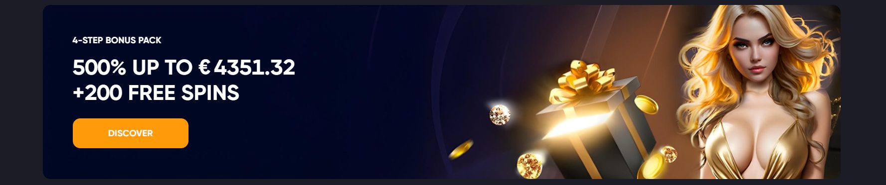 Taip pat galite gauti 500% pasveikinimo paketą, kurio premija siekia iki 4 351,32 € ir 200 nemokamų sukimų per pirmus keturis įnašus: