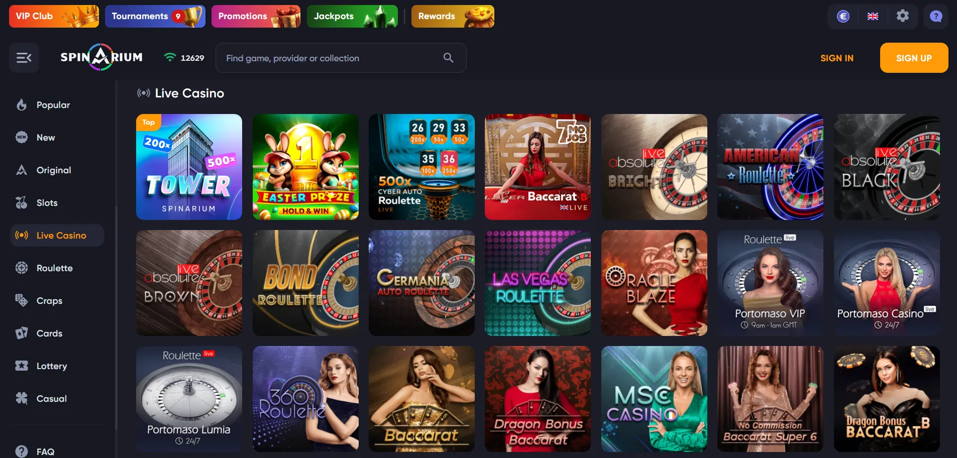 Pats metas išplėsti savo pojūčius su daugiau nei 850 gyvų kazino žaidimų, kuriuos siūlo „Spinarium“ kazino. Šis kazino bendradarbiauja su pirmaujančiais tiekėjais, tokiais kaip „Evolution“ ir „Absolute Live“ „Gaming“, kad suteiktų jums geriausią patirtį.